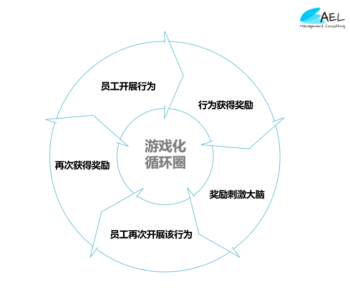 其实,游戏化已经在商业领域得到了广泛运用,并且得到了显著的回报。无论将“游戏化”运用到科研、政治、社会还是商业,它都能通过其鲜明的特点使原本枯燥的工作变得轻松有趣。“游戏化”之所以能起到作用,更多是与心理学的知识相关。下图是一个关于“游戏化”作用于员工行为的循环圈概念,造成员工这样循环的是一种我们非常熟悉的神经传导物质——多巴胺。多巴胺主要传递人们关于“兴奋与开心”的信息。当我们感到开心、兴奋,甚至非常爽的感觉,就是多巴胺在分泌。许多人的各种“上瘾”就是因为某件事让他的多巴胺一下子增多的缘故。